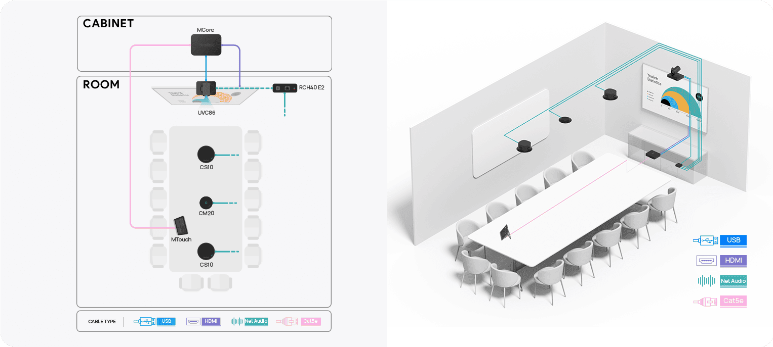 Ketiga komponen ini bekerja secara terintegrasi untuk menghasilkan pengalaman rapat yang imersif, bebas perangkat di meja, dan mudah diatur.
