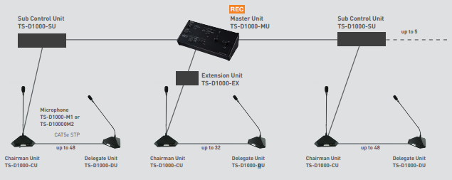 Satu unit Master Control mengendalikan hingga 24 unit konferensi, lalu pengguna dapat memperluas sistem dengan menambahkan sub-control untuk kebutuhan ruang rapat yang lebih besar. Fleksibilitas ini menjadikan TS-D1000 cocok untuk ruang rapat kecil, menengah, hingga boardroom besar.