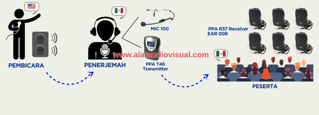 Sistem ini bekerja dengan metode komunikasi satu arah (one-way communication), di mana satu pembicara memancarkan suara dan banyak peserta menerima audio tersebut melalui perangkat masing-masing.